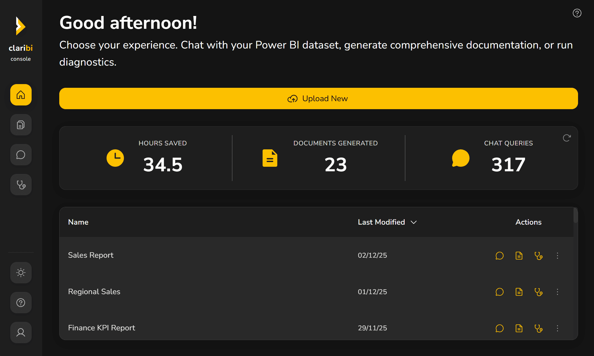 Ask questions about your Power BI datasets and reports and get precise, actionable answers in seconds. Whether you need a new DAX measure, help with complex logic, support with report visuals or ideas for model improvements, simply describe what you need and Claribi Console responds instantly with guidance tailored to your reports.